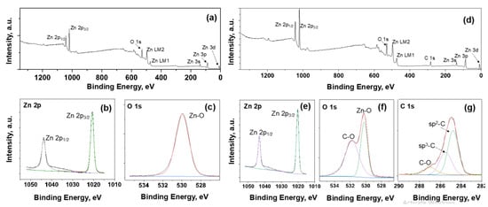 The XPS spectra of ZnO and OH-MWCNT/ZnO is presented in Figure 3. The survey peak of the synthesized ZnO nanoparticles is shown in Figure 3a indicates the presence of zinc and oxygen. Figure 3b,c shows the high-resolution XPS spectra of Zn 2p and O 1S, respectively. The two clear, distinct peaks located at 1021.3 and 1044.4 eV are attributed to the spin-orbit of Zn 2p3/2 and Zn 2p1/2, respectively. The energy splitting between the Zn 2p1/2 and Zn 2p3/2 is ~23.1 eV is in agreement with the reported value [24]. The O 1s core peak (Figure 3c) of ZnO nanoparticles shows one distinct peak at 529.8 eV associated with O2- ions in the Zn–O bonding of the ZnO nanoparticle [24]. The survey peak of OH-MWCNT/ZnO composite is shown in Figure 3d indicates the presence of zinc, oxygen, and carbon. The high-resolution XPS peaks of the Zn presented in Figure 3e reveals two binding energy peaks at 1021.3 and 1044.4 eV associated with Zn 2p1/2 and Zn 2p3/2 spin-orbit splitting, respectively. The result indicates that there is no change in the chemical state of Zn in the OH-MWCNT/ZnO composite compared to that of Zn in the ZnO nanoparticle. However, the O 1s peak (Figure 3f) of OH-MWCNT/ZnO composite is resolved into two peaks centered at 529.8 and 532.0 eV, representing the Zn-O bonding and C–O, respectively. The C 1s peak (Figure 3g) was fitted into three peaks centered at 584.7, 585.4, and 586.9 eV. The peak centered at 586.9 eV is associated with C–O groups in the form of C–OH [25]. The sp2 and sp3 hybridized carbon peaks were observed at 284.7 and 285.4 eV respectively [26]. The result suggests the formation of a composite material.
