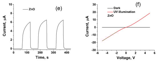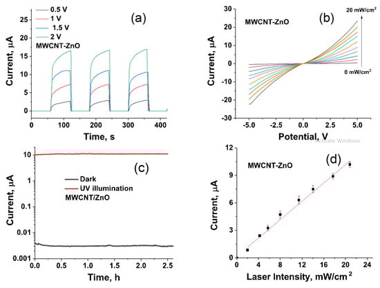 The devices (composite (OH-MWCNT/ZnO) and ZnO alone) have shown distinct electrical responses to the UV radiation, as shown in Figure 5. The current time characteristics of a fabricated nanocomposite sensor under cyclic on-off illumination of 20 mW/cm2 UV radiation at applied bias in the range of 0.5 V to 2 V is presented in Figure 5a. The response time and recovery time of the sensor calculated at 1.5 V bias current (Figure 5a) are 1.2 s and 0.8 s, respectively. The photocurrent increased with the increase in bias voltage. The current-voltage (I-V) characteristics of a fabricated nanocomposite sensor at a constant bias of 1.5 V measured in the range of 0 to 20 mW/ cm2 UV illumination conditions are shown in Figure 5b. As the intensity of UV radiation increased, the current response of the device increased. Figure 5c represents the time-dependent stability of the sensor over a duration of 2.5 h under a dark and continuous illumination of 20 mW/cm2 UV radiation. Figure 5c shows that electric conductivity increased by over three orders of magnitude upon exposure of UV radiation. In addition, the results show the stability of the sensor over prolonged exposure time. The variation of the current with the change in the illuminated UV intensity at the constant bias of 1.5 voltage is presented in Figure 5d. According to Figure 5d, the linear relation (R2 = 0.987) was observed between the photocurrent and the intensity of UV radiation. The result demonstrates the wide dynamic range of the fabricated device. The current time characteristics of a fabricated pristine ZnO sensor at a constant bias of 1.5 V measured under periodic exposure of 20 mW/cm2 UV radiation is shown in Figure 5e. The composite material has demonstrated a ~66% higher photocurrent response than ZnO alone (Figure 5a,e). The result shows the benefit of the composite material over the pristine metal oxide semiconductor. The current-voltage characteristics of a fabricated ZnO sensor measured under dark and 20 mW/ cm2 UV illuminated conditions are shown in Figure 5f.
