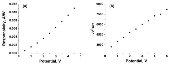 Responsivity measures the input-output gain of the sensor and is defined by the ratio of the photocurrent to the incident optical power of UV radiation [27]. Figure 6a shows the responsivity of the device with respect to change in the applied bias voltage. The responsivity increased with an increase in the bias voltage. The calculated value of the responsivity at an applied 5V bias was 0.011 A/W. The photoresponse (ratio of current at UV illumination to dark) with respect to applied bias is presented in Figure 6b. The data shows the nearly linear relation between the photoresponse and the applied bias.