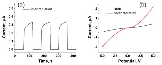 To demonstrate the real-life application of the device, the flexible fabricated composite sensor was tested under solar radiation. Figure 7a shows a cyclic UV response of the sensor, and Figure 7b shows an I-V characteristic of the device under solar radiation and the dark current radiation. This shows the potential application of the device as a real-time wearable UV sensor. The solar UV intensity was calculated using a linear equation obtained from Figure 5d was ~2.1 mW/cm2. The typical UV intensity of solar radiation (280 to 400 nm) is 2 to 5 mW/cm2 [28].