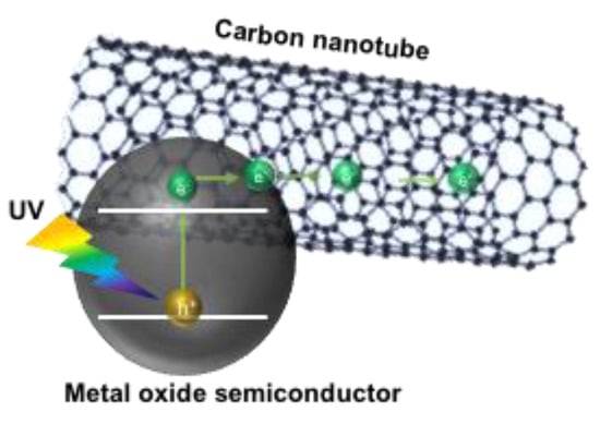 A nanomaterial-based metal oxide semiconductor has been recognized as an alternative to the silicon-based technology due to flexibility and the wide bandgap that can be exploited for UV sensing. Metal oxides can be assembled as a thin film on a wide range of substrates using a cost-effective wet chemical approach [7]. Among the various metal oxides, ZnO, CuO, and TiO2 are promising metal oxide semiconductors for their chemical stability, low toxicity, and high selectivity [8,9,10]. ZnO is one of the most widely studied oxide materials for UV sensing applications because of a high exciton binding energy of 60 meV and a wide bandgap of 3.37 eV [11,12]. However, pristine ZnO-based UV sensors have shown low sensitivity, which makes it unsuitable for the real-time measurement of UV radiation. Carbon is earth abundant, low cost material that can be introduced to a metal oxide semiconductor for an effective charge separation and transportation [13,14]. Various carbon allotropes such as fullerenes, carbon nanotubes, and graphene have been studied for nanoelectronics, optoelectronics, supercapacitors, and solar cell applications in the past few decades [15,16]. Several groups have studied the carbon nanotube metal oxide semiconductor network for UV sensing and gas sensing applications [17,18,19,20]. However, improvements in the performance of the device due to the incorporation of carbon allotropes is highly affected by its random aggregation [14]. Yi et al. have studied the influence of the presence of functional groups on the aggregation kinetics of the multiwalled carbon nanotube [21]. The result suggested that the oxidized carbon nanotube (carbonyl, carboxyl, and hydroxyl groups) is more stable to aggregation and deposition.