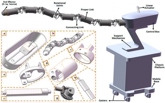 Design of the flexible snake-like robot: (a) translational joint mechanism, (b) flexible links with rotational joints, (c) end caps, (d) proper link, (e) connecting link, (f) inter-module and intra-module link connectors, (g) rotational joint mechanism, and (h) linear actuator.