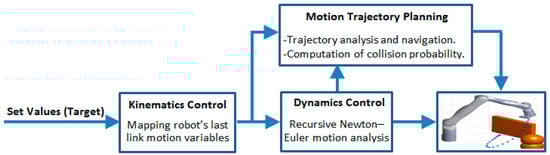 Conversely, a given terminal force and moment, which is expected to act on the last link of the robot, are propagated inward from the last link down to the base link to compute the forces and moments acting on the initial links. In this step, results obtained for each link during the forward recursions are applied to determine the force () and moment () given in Equations (17) and (18), respectively, during backward recursions, where and are the mass and moments of inertia taken at , respectively, and are aligned with the output coordinate system of link j; is the moment of inertia of the rotor in the motor at the jth joint; and is the torque acting on the jth joint. In the final equation of the dynamic constraints model, the resultant generalized forces, otherwise taken as torque acting at the initial joints, are computed using Equation (19). For faster dynamics analysis during control navigation of the flexible robot, only one frame transformation is utilized for forward and backward recursions, unlike in Luh et al. []. However, frictional forces acting at the robot’s joints are not considered in this study.