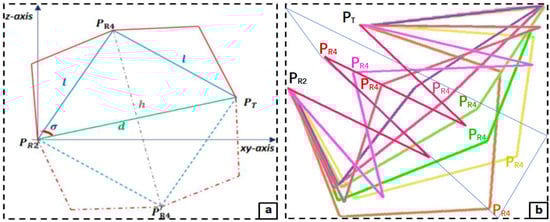 Navigation of the remaining four links can be viewed in a planar XY/Z axis. These links can be sub-divided as two equidistant two-link mechanisms whose common joint is a mid-point selected arbitrarily along the ash line with height , as typified with blue lines in Figure 3a. By varying the coordinates of the mid-point (), the locations of the virtual points and change with the base angle; thereby, the two two-link mechanisms and can attain diverse poses, as shown Figure 3b. Vertices locations for any of the poses can be obtained with the triangulation expressions in Equations (5) and (6). The base angle ( is computed such that each mechanism forms an isosceles triangle, while and are the length of either of the isosceles sides of the triangle and the length of the base side, respectively.