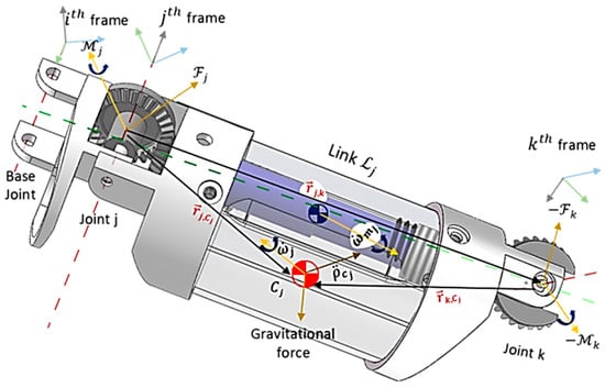 Since the initial velocity and acceleration of the base link are assumed, the higher motion variables at the robot’s joints are propagated outward from the base link up to the last link while navigating the robot. During the motion, the values of the variables are computed using Equations (12)–(16):