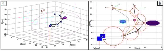 Optimal mid and virtual points are needed to achieve a stable and collision-free point-to-point motion. Collision is analyzed in Figure 5a using a unique rotation axis of the robot’s links in the workspace. The internal organs in the human body are taken as obstacles during MIS procedures. In this study, polyhedral objects are generated in the robot’s workspace, as shown in the 3D view. Since the robot’s last four links have a unique operational plane whose orientation depends on the respective offset and angle of each of the first two links, during each stepwise movement, only a polygonal area of the polyhedral obstacles that falls onto the operational plane is required for collision detection. While the via-points of a desired trajectory are sequentially set as input for motion planning and control, the probability of collision () between lth link of the robot’s with any kth obstacle in the workspace is determined using Equation (25). In the analytical method, it is assumed that each link and each obstacle in a manipulable area of the robot’s workspace are circumscribed in unique circles along a rotation axis of the lth link, where , and are independent radiuses of the links and obstacles in the workspace, respectively.