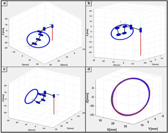 A comparison between the desired via-points and the actual points obtained when the geometric IK technique was used during the circular path tracking is presented as Figure 7d. The blue and red points are the desired via-points generated using Equation (11) and the actual points computed from the IK model, respectively. By analyzing the kinematic results obtained when the 3D circular paths were tracked by the flexible robot, it was observed that the IK model had accurately reached more than 90% of all points in the circular path with 100 via-points; that is, n = 1. With a kinematics error threshold of 1 mm, an average kinematics error of 0.37 ± 0.36 mm was obtained from the 100 points with a 92% reachability. Besides the error offset analysis, the performance of the kinematic constraint model was also observed in terms of the model’s run-time taken to resolve the IK for each point. The run-time was the average execution time the model took to compute the IK of a single point over all the points in each circular movement. The geometric IK method had a maximum average response time of 0.061 s over all three trials. This was significantly close to zero relative to the time taken to reach each point in the six-link robot’s workspace. To the best of our knowledge, there exists no single method that has solved the IK of such a modular configuration with both a high accuracy and a short computational time simultaneously.