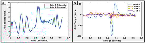 The latter was done by propagating zero initial velocities and acceleration outward from the stationary base link of the robot, while the terminal force and moment at the last link were set to zero. Thus, with other required parameters required by the dynamic model, the generalized forces acting at each joint of the robot during the point-to-point circular motion were computed as shown in Figure 8. It can be observed that the consecutive transitions of the robot’s joints over all the consecutive via-points were relatively steady for the last four revolute joints. This could be attributed to the highly accurate IK constraints with the resolution achieved in a timely manner.