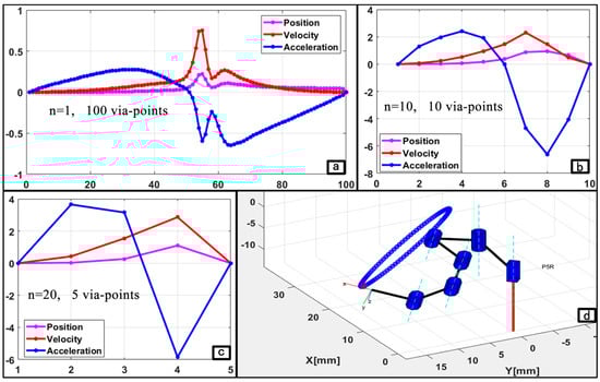 As presented above, results from the kinematics and dynamics model were plausible for the navigation along the given paths. The points in each path were assigned as an admissible motion trajectory as computed by the planning strategy developed in Section 3.3. The selection of the trajectory control basis was based on the flexibility of the robot’s structure and navigation along the circular path. Thus, sequences of the via-points were referenced in joint space for the trajectory planning, while the robot tracked the circular path in a point-to-point manner. The three scenarios of n via-points (i.e., n = 1, 10, and 20) were studied to validate the trajectory constraints model across the time splines. For convenience, the sequence of points obtained for each case was assigned and the corresponding joint variables computed in the workspace were followed for proper monitoring of the executed trajectories during navigation. The via-points were validated using the motion profile obtained when the cycloidal trajectory model in Equations (21)–(23) was implemented.