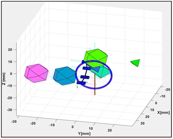 Objects that are not of interest in a workspace or links making-up the flexible robot can be deemed as obstacles, and these can hinder the steady or continuous motion of a robotic mechanism when moving along a pathway with a pre-planned trajectory, which reduces the efficiency of the trajectory planning system. The avoidance of collision with obstacles in the workspace was initiated during the point-to-point navigation trials. For this purpose, polyhedral-shaped objects were randomly introduced as workspace obstacles while the trajectory model was executed. The interpolation of the robot’s links with each obstacle in the workspace was checked and the for the potential collision points were calculated in accordance with Section 3.3. Since each polygonal area was encircled, the algorithm checked for interpolation using the center and radius of both circles to decide whether a collision with an obstacle may occur and to trigger any necessary avoidance. Again, Equation (10) was used to generate a circular path while tracking scenarios with multiple obstacles were established to validate the avoidance model. Figure 10 shows a scenario with five different obstacles in the robot’s workspace. Collision-free movement was obtained by using poses with the value of PoC ≈ 0 from the pool of the robot’s poses generated using the IK scheme in Section 3.2 as the robot moved along with the desired trajectory in the circular paths.