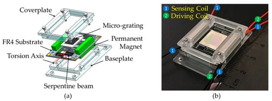 (a) Schematic drawing of the assembled flame-retardant 4 (FR4)-based electromagnetic scanning micrograting; and, (b) a photograph of the prototype of the FR4 scanning micrograting integrated with a driving coil and a pair of sensors.