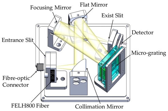 Previous experience has illustrated the feasibility of a crossed Czerny–Turner system as part of a modified version [] in further broadening the spectral range and improving the signal-to-noise ratio. This paper presents a modified crossed Czerny–Turner optical system. First, we used an astigmatism-free compact Czerny–Turner optical design that was based on an off-axis parabolic mirror. Following previous research, the object distance was reduced and the exit slit was enlarged in order to improve the signal-to-noise ratio (SNR) and the dynamic response of the spectrum. Thus, the entrance slit was reduced to improve the resolution. In the design, a single-tube two-color detector reduces the scanning angle of the dual-detector-based spectrometer and it detects the full near-infrared spectrum. Figure 2 shows the optical layout. The light radiation passes through a vertical 40-μm entrance slit aperture and it is collimated by an off-axis parabolic mirror (focal length of 25.4 mm). The parallel beam enters the scanning grating through the plane mirror, and the negative first-order diffraction enters a spherical mirror (focal length of 50 mm), which focuses the beam toward the two-color detector (Hamamatsu K11908-010K, Hamamatsu, Japan) through the vertical 100-μm exit slit aperture. A K1908-010K incorporates an InGaAs PIN photodiode (top InGaAs: cutoff wavelength ) and then mounted over a long-wavelength type InGaAs PIN photodiode (bottom InGaAs: ) along the same optical axis. An 800 nm long-pass filter is used as a second-order filter after the entrance slit, in accordance with the principle of diffraction.