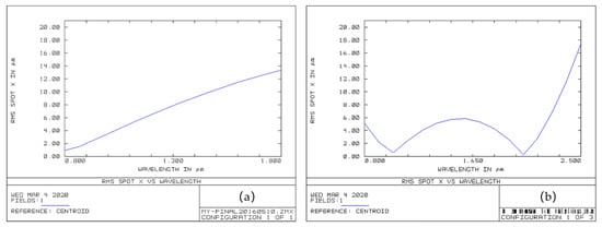 The astigmatism of the optical system can be evaluated by the size of the root mean square (RMS) spot radius x (using ZEMAX software, Version, Kirkland, WA, USA) []. We compared the modified crossed Czerny–Turner optical design to our previous optical structure to evaluate the broadband astigmatism correction [], as shown in Figure 3. Obviously, for the previous optical structure, the maximum RMS spot radius x was about 14 µm in an 800–1800 nm spectral range, as shown in Figure 3a. However, for the modified crossed Czerny–Turner optical design, the RMS spot radius x was approximately 6 µm in an 800–1800 nm spectral range, and the maximum spot was less than 18 µm in the wavelength range from 800 to 2500 nm, as shown in Figure 3b. The results demonstrated that the modified crossed Czerny–Turner optical design corrects astigmatism and it performs better than other models.