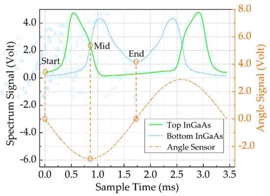 where and represent the incidence angle and diffraction angle of the grating at the center of the wavelength, respectively; and, is the grating constant. Finally, the spectral signal and angle sensor signal output in the time domain (by the single-tube, two-color detector) can be obtained through the acquisition circuit. The two-color detector, which is different from a single-tube detector in terms of spectral reconstruction, is shown in Figure 4. The top InGaAs and bottom InGaAs acquire two spectra, 800–1650 nm and 1650–2500 nm, respectively. When the grating is scanned from the initial position to the position of the maximum amplitude, the wavelength slides over the detector from the center wavelength to the minimum wavelength or maximum wavelength, so that a spectrum is obtained from 1650 nm to 800 nm or 2500 nm. The same spectrum is obtained when the grating rotates back to the initial position in the opposite direction. Therefore, the start and end points of one spectral period are exactly the two adjacent minimum amplitudes values positions of the angle sensor output, which correspond to the two adjacent maximum amplitudes values positions of the grating plate. The middle point of the spectral period exactly correspond to the maximum amplitude value position of the angle sensor output, where the position of the grating is perpendicular to the neutral plane of the magnetic field.
