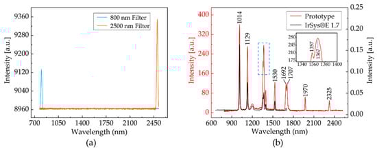 The spectral resolution of the spectrometer primarily depended on the widths of the input and exit slits and on the reciprocal dispersion of the diffraction grating. Section 2 covers the parameters of the design. The spectral resolution was calculated from the two adjacent peaks of the characteristic spectral lines of the high-pressure mercury lamp light source with a 400-µm silica fiber as the connector between the light source and the spectrometer. An irSys® E 1.7 NIR spectrometer produced by the German company TQ-Systems GmbH was used for a comparative test to verify the accuracy of the test using the high-pressure mercury lamp []. The irSys® E 1.7 NIR spectrometer has a wavelength range of 660–1730 nm and resolution of 8 nm. It is worth noting that the irSys® E series of NIR spectrometers includes a long-pass filter within the products. Figure 6b depicts the results of the measurements. As the measurement results suggest, all of the characteristic peaks of the two mercury lamp spectral lines basically coincided []; and, two adjacent peaks at 1357 nm and 1367 nm can be clearly distinguished within the spectral range from 800–1650 nm. Similarly, two adjacent peaks at 1692 nm and 1707 nm can also be clearly distinguished in the spectral range from 1650–2500 nm. Thus, this indicated that the resolution in our spectrometer was better than 10 nm for the top InGaAs detector and better than 15 nm for the bottom InGaAs detector [].