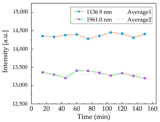 A calibrated spectrum curve was processed using our laboratory’s spectrum software to obtain the spectral peaks corresponding to two non-cooled detectors and the wavelengths corresponding to these peaks to measure long-term stability. The detection wavelengths of the top (i.e., 800–1650 nm) and bottom (i.e., 1650–2500 nm) detectors were 1136.9 nm and 1961.0 nm, respectively. For a period of 150 min, a set of scanning spectra was acquired every 15 min at ambient temperatures of about 25 °C. We used the 10 measurements to analyze the degree of dispersion of the spectral peaks, as shown in Figure 7. We calculated that the maximum spectral fluctuation did not exceed 1.5%, and the wavelength stability was better than ±1 nm and ±2 nm at 1136.9 nm and 1961.0 nm, respectively. We utilized the standard deviation within a dark spectrum to measure the noise, and the spectral signal was characterized using the average value of the spectrum to calculate the signal-to-noise ratio (SNR). The preliminary measurements suggested that at the said resolution, the SNR was 284 at 1136.9 nm and 188 at 1961.0 nm after only instance of averaging when a single scan acquired within 1.8 ms, respectively. SNRs can be improved by increasing the number of co-added scans since intra-spectral noise can be improved by averaging, but at the expense of measurement time [,]. Here, the SNR of full spectrum reached 3928 with 100 added scans.