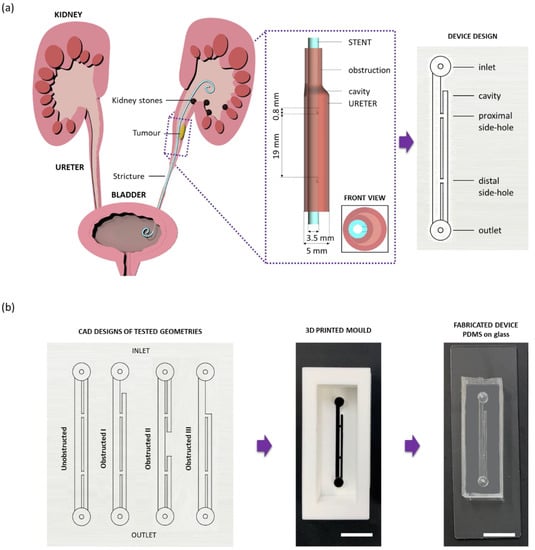 Ureters are conduits that connect kidneys to the bladder, allowing for the urine produced by the kidneys to drain through the distal urinary system. Under physiological conditions, peristaltic contractions of the ureteral wall govern transport of urine towards the bladder. However, in some pathological cases, localised shrinkage of the cross-sectional area of the ureter can occur, impairing the physiological passage of urine. This can be due to a number of conditions, such as kidney stones lodging within the ureteral lumen, tumours compressing the ureteral wall, or inflammatory strictures (Figure 1a) [,,]. If not treated, a ureteral obstruction can lead to several health complications. In order to prevent or alleviate these complications, clinicians often recur to the deployment of a ureteral stent. Stents are flexible hollow tubes that provide an alternative pathway for the urine to bypass ureteral obstructions. A common stent design includes two double-J ends to prevent stent migration, and side-holes punched through its wall in order to promote urinary drainage and bypass the obstructed ureteral section [,,,]. Although they are widely used in clinical settings, normal ureteral stent function can be compromised by problems or side effects, including urothelial irritation, stent migration, encrustation due to attachment of crystalline particles, and biofilm formation due to bacterial colonisation [,,]. In addition to reducing a patient’s quality of life, these complications inevitably lead to an increased economic burden, since stent replacement, additional clinical procedures, and aftercare may be required [,].