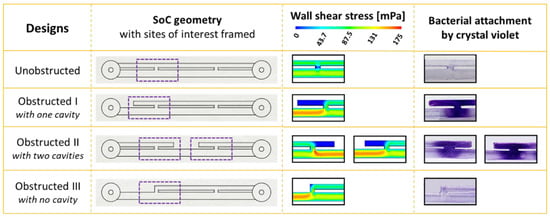 Figure 2 shows the WSS distribution over the bottom surface of the unobstructed and obstructed I designs, as determined from CFD simulations, along with corresponding images of crystal violet staining, highlighting regions of greater bacterial attachment.