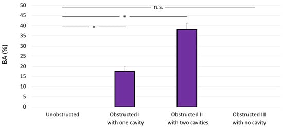 Bacterial attachment directly correlates with the number of cavities. The bacterial coverage area (BA) was calculated by analysis of crystal violet images, considering the entire channel volume of the chip for all designs. The unobstructed and “obstructed III with no cavity” designs show null coverage area, whereas the obstructed I and obstructed II designs show an average value of 17.5% ± 2.6% and 38.1% ± 3.2%, respectively. Data are reported as average ± standard deviation (n = 3). Note: * p < 0.05.