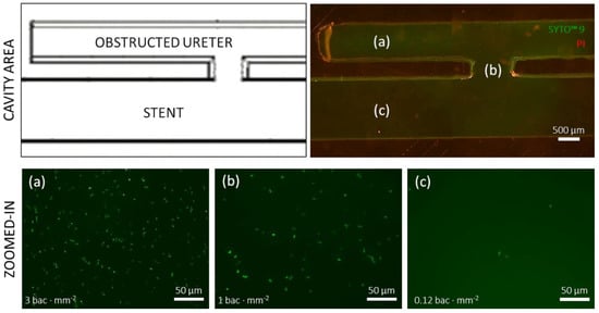 Crystal violet staining showed significant bacterial attachment within the hydrodynamic cavities located nearby ureteral occlusions, which also extended to influence neighbouring regions (including side-holes of the stent). In order to obtain additional insights about the spatial distribution of bacteria in these regions, fluorescence microscopy images of fluorescently labelled bacteria in the obstructed I SoC device were acquired (Figure 4). The obstructed I device was chosen as a representative model for imaging of bacterial attachment in regions where crystal violet staining was observed. After 1 h, bacteria maintained detectable SYTO™ 9 staining whilst propidium iodide staining was absent. Moreover, images revealed that there was a difference in the bacterial number density between the cavity region, the side-hole, and the segment of stent lumen closer to the SoC inlet. Bacteria were present at greater number density (3 bacteria·mm−2) in the cavity, which is the region characterised by the lowest wall shear stress levels (WSS << 40 mPa) and the presence of laminar vortices (Figure 4a). The bacterial density decreased to 1 bacterium·mm−2 (Figure 4b) in the side-hole (WSS ~85 mPa), and to 0.12 bacteria·mm−2 (Figure 4c) in a region of the stent lumen located in proximity to the SoC inlet (WSS = ~130 mPa). Generally, the bacterial number density was greater in proximity to the side walls of the device.