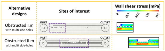 Based upon the results from this study, a potential design solution is herein proposed that could reduce the amount of bacterial attachment within the stented ureter. In order to reduce the extent of cavity flow, several side-holes could be manufactured near a ureteral occlusion (both proximally and distally), where the location of occlusion could be determined on a patient-specific basis from medical images (i.e., MRI scans). These multi side-hole designs have been evaluated through CFD simulations (Figure 5), by applying this design approach to the SoC models shown earlier in Figure 2 (obstructed I) and Figure 3 (obstructed II), demonstrating potential to enhance drainage and increase WSS in the vicinity of a ureteral occlusion. By adding multiple side-holes in proximity to the occlusion, WSS at the cavity increased from <<40 mPa (as seen in Figure 2 and Figure 3) to values > 40 mPa, which is likely to prevent short-term bacterial attachment.