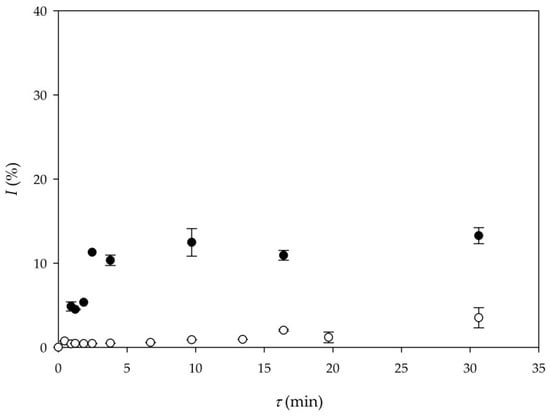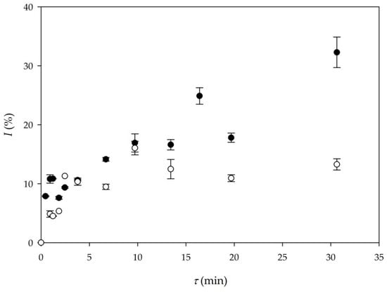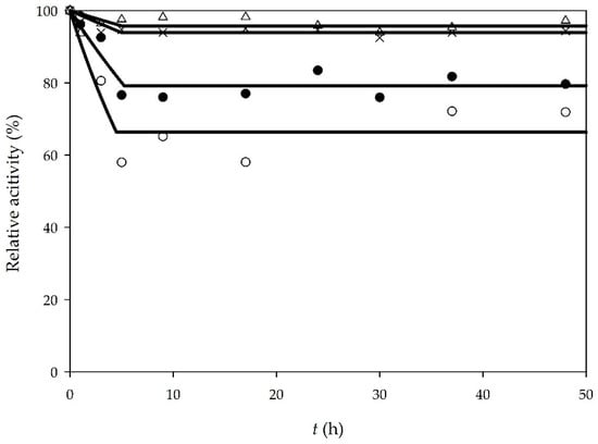In order to determine the enzyme operational stability decay rate, Equation (1) was used. For the first 5 h of experiments, if sunflower oil was used as a substrate, the enzyme operational stability decay rate was kdsunflower oil/buffer = 0.091 ± 0.015 1/h and when WCO was used, the enzyme operational stability decay rate was kdWCO/buffer = 0.044 ± 0.007 1/h.