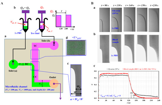 To squeeze out the air bubble inside the microfluidic channels and avoid adherence of RBCs to the channels, microfluidic channels were filled with a bovine serum albumin of 2 mg/mL through the outlet. After an elapse of 10 min, the microfluidic channels were filled again with 1× PBS. As shown in Figure 1A-b, a reference fluid syringe was filled with 1× PBS (~0.5 mL) and air cavity (Vair, R), respectively. Likewise, a test fluid syringe was filled with a test fluid (~0.5 mL) and air cavity (Vair, T), respectively. To supply the reference fluid into the reference fluid channel, a polyethylene tubing (length = 300 mm, inner diameter = 0.25 mm, and thickness= 0.25 mm) was connected from a syringe needle to inlet (a). To infuse the test fluid into the blood sample channel, a polyethylene tubing (length = 300 mm, inner diameter = 0.25 mm, and thickness = 0.25 mm) was connected from a syringe needle to inlet (b). To collect both samples from the co-flowing channel, a polyethylene tubing (length = 200 mm, inner diameter = 0.25 mm, and thickness = 0.25 mm) was fitted tightly into the outlet. Using two syringe pumps (neMESYS, Cetoni Gmbh, Korbussen, Germany), the reference fluid was infused at a constant flow rate of QR = Q0. The test fluid was supplied at periodic on-off fashion (period (T) = 240 s, duty ratio = 0.5, and QT = Q0). A microfluidic device was placed on an optical inverted microscope (BX51, Olympus, Tokyo, Japan) equipped with a 10× objective lens (NA = 0.25). A high-speed camera (FASTCAM MINI, Photron, Tokyo, Japan) captured two microscopic images sequentially at a frame rate of 500 fps. The image acquisition continued at an interval of 0.5 s with a function generator. All experiments were conducted at a temperature of 25 °C.