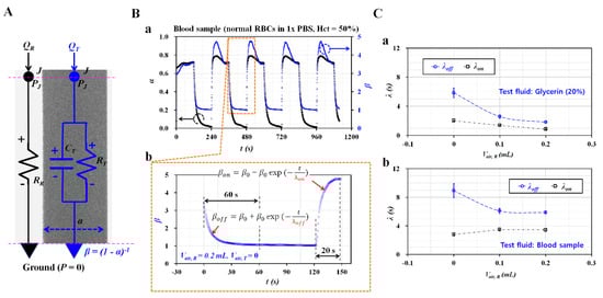 As shown in Figure 2B-a, temporal variations of α and β were obtained with respect to the blood sample (normal RBCs suspended in 1× PBS, Hct = 50%). Here, the air cavity in the reference fluid syringe was set to 0.2 mL (Vair, R = 0.2 mL). Based on Equation (2), the temporal variations of β were represented as shown in Figure 2B-b. When sequentially turning syringe pumps on and off, two time constants (λoff, λon) could be obtained by analyzing transient variations of β. First, under the turn-off operation of a syringe pump, temporal variations of βoff were extracted for 60 s. Based on an exponential model (i.e., βoff = β0 + β1 exp (-t/λoff)), λoff was obtained by conducting nonlinear regression analysis with Matlab 2019. Second, under the turn-on operation of a syringe pump, βon converged in a shorter time interval than for βoff. Temporal variations of βon were extracted for 20 s. Similarly, based on an exponential model (i.e., βon = β0 + β1 exp (-t/λon)), λon was obtained by conducting non-linear regression analysis. Figure 2C-a shows variations of λoff and λon with respect to Vair, R and glycerin (20%). All experimental data were expressed as mean ± standard deviation. The error bar represented single standard deviation. Note that λoff was much longer than λon within 0.2 mL of the air cavity. Additionally, λoff decreased substantially when the cavity volume increased from 0 to 0.1 mL. Above Vair, R = 0.1 mL, it decreased slightly. Figure 2C-b shows variations of λoff and λon with respect to Vair, R and the blood sample. Similar to the glycerin solution, λoff decreased considerably when the air cavity increased from 0 to 0.1 mL. The air cavity in the reference fluid syringe (~0.1 mL) contributed to decreasing the time constant (λoff) significantly. However, λon did not present distinctive variations with respect to the air cavity in the reference fluid syringe. Additionally, two time constants remained unchanged above Vair, R = 0.1 mL. According to discrete fluidic circuit analysis, air compliance (C) plays a role in regulating the alternating component of the flow rate. In this study, flow rate of the reference fluid remained unchanged over time. It was modeled as direct component of flow rate. Thus, air cavity secured in reference syringe did not contribute to the changing time constant. However, air cavity with 0.1 mL decreased time constant substantially. Taking into account the fact that air compliance caused the time constant to increase generally, the result showed different trends. Above a 0.1 mL air cavity, the time constant varied slightly. The constant value of the time constant was obtained through fluid viscosity and the compliance effect of the tubing and PDMS device. According to these experimental results, the air cavity in the reference fluid syringe (~0.1 mL) contributed to decreasing λoff greatly. Note that λoff decreased more significantly than λon. Above an air cavity volume of 0.1 mL, the time constants did not present substantial variation.