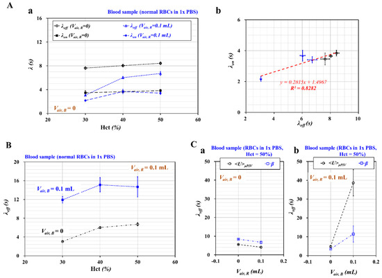 Quantitative evaluations of time constants (λoff, λon) with respect to hematocrit and air cavity in each syringe. Here, a blood sample was prepared by adding normal RBCs into 1× PBS. (A) The comparison of two time constants with respect to hematocrit and air cavity. (a) Variations of λoff and λon with respect to Hct = 30%, 40%, and 50% and Vair, R = 0 and 0.1 mL. (b) Linear relationship between λoff and λon. Here, the air cavity in the blood sample syringe was set to zero. (B) Variations of λoff and λon with respect to Hct = 30%, 40%, and 50% with Vair, B = 0 and 0.1 mL. Here, the air cavity in the reference fluid syringe was set to 0.1 mL. (C) Quantitative comparison of λoff obtained from <U>μPIV and β. The hematocrit of the blood sample was adjusted to Hct = 50% by adding normal RBCs into 1× PBS. (a) Comparison of λoff obtained from <U>μPIV and β with respect to Vair, R = 0 and 0.1 mL. Here, the air cavity in the blood sample syringe was set to zero. (b) Comparison of λoff obtained from <U>μPIV and β with respect to Vair, B = 0 and 0.1 mL. Here, the air cavity in the reference fluid syringe was set to 0.1 mL.
