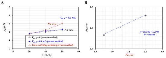 As shown in Figure 4A, μB tended to increase with respect to Hct. As expected, the air cavity in the blood sample syringe did not contribute to varying blood viscosity. In addition, it was inferred that the air cavity in the reference fluid syringe (~0.1 mL) was sufficient to maintain a constant flow rate, even at Vair, B = 0.