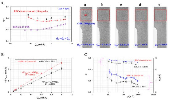Variations of <U>μPIV with respect to Qsp and diluent were obtained, as shown in Figure 5B. The value of <U>μPIV tended to increase linearly with respect to Qsp. According to linear regression analysis, a linear regression formula for each diluent was obtained: <U>μPIV = 2.6287 Qsp (R2 = 0.9971) for dextran solution (10 mg/mL) and <U>μPIV = 2.0732 Qsp (R2 = 0.9956) for 1× PBS. These results indicated that RBCs suspended in dextran solution reached a higher value of <U>μPIV (~26.8%) compared with RBCs suspended in 1× PBS.