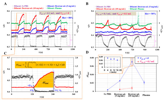 First, as shown in Figure 6A, temporal variations of <I> and <U>μPIV were obtained with respect to diluents. Here, the air cavity in the blood sample syringe was set to Vair, R = 0. When the syringe pump was turned off periodically, <U>μPIV decreased suddenly over time. RBC aggregation increased <I> gradually over time. Given that 1× PBS did not stimulate RBC aggregation, <I> of 1× PBS remain unchanged over time. However, two dextran solutions contributed to increasing <I> over time substantially. Given that plasma proteins contributed to RBC aggregation [43,44], <I> of plasma increased gradually over time.