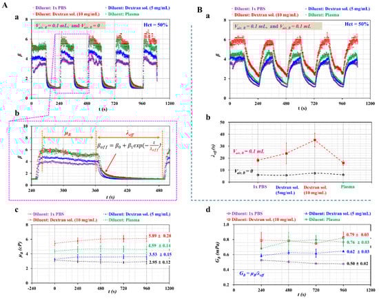 Second, as shown in Figure 7A-a, the temporal variations of β were obtained with respect to diluent. Air cavities of each syringe were set to Vair, R = 0.1 mL and Vair, B = 0, respectively. Among the values of β obtained in Figure 7A-a, to represent how the blood viscosity (μB) and the time constant (λoff) were quantified over a single period, temporal variations of β were redrawn at specific durations ranging from t = 240 s to t = 500 s.