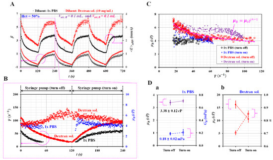 Given that the flow rate of the blood sample varied over time, the formula of blood viscosity was corrected as μB = μR × (β − 1) × F2 × (QR/QB) by adding a flow rate term into Equation (3). Figure 8B shows temporal variations of and μB with respect to diluent during a single period of 240 s. Note that μB presented large scattering at Qsp < 0.1 mL/h. Thus, the minimum value of Qsp was set to 0.1 mL/h. As shown in Figure 8C, variations of μB were obtained with respect to during the turn-on and turn-off operation of the syringe pump. For 1× PBS as diluent, μB remained constant with respect to the shear rate. However, for the dextran solution as diluent, μB decreased gradually with respect to the shear rate. As shown in Figure 8D-a, variations of μB and GB were obtained with respect to the syringe operation (i.e., turn-on, turn-off). Given that μB remained unchanged over the shear rate, GB was calculated by dividing μB by the time constant (i.e., GB = μB/λoff for turn-off operation, and GB = μB/λon for turn-on operation). The value of μB for each operation was obtained as μB =3.38 ± 0.19 cP for the turn-off operation, and μB = 3.52 ± 0.12 cP for the turn-on operation. Additionally, the value of GB for each operation was obtained as GB = 0.18 ± 0.02 cP for the turn-off operation, and GB = 0.21 ± 0.05 cP for the turn-on operation. From these results, μB and GB remained unchanged irrespective of the syringe operation. Compared with the results obtained at Vair, B = 0 as showed in Figure 7A-c, a 0.1-mL air cavity (~0.1 mL) in the blood sample syringe caused to overestimate μB. However, it caused GB to be underestimated. Figure 8D-b shows variations of and n with respect to the first dextran solution (10 mg/mL) and syringe operation. The constant decreased significantly by switching the syringe pump from turn-off operation to turn-on operation. In addition, the turn-on operation caused to increase the index n substantially compared with the turn-off operation.