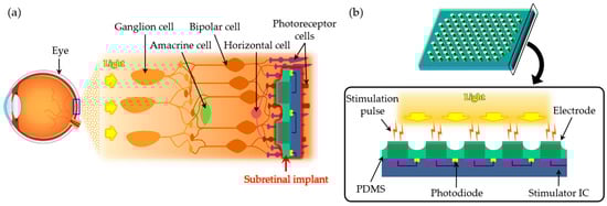 Retinal degenerative diseases are one of the causes that impair the vision of patients. Age-related macular degeneration (AMD) and retinitis pigmentosa (RP) are the diseases caused by the degeneration of photoreceptors, which finally lead to visual loss [,,,]. Photoreceptor cells consist of rod and cone cells in the retina, and these cells convert light entering the eye into electrical signals. However, if photoreceptors are lost because of AMD and RP, these signals cannot be generated and transmitted to non-spiking neurons in the inner nuclear layer (INL) []. Thus, this results in no responses of the retinal ganglion cells (RGCs) that transmit the signals to the optic nerve.