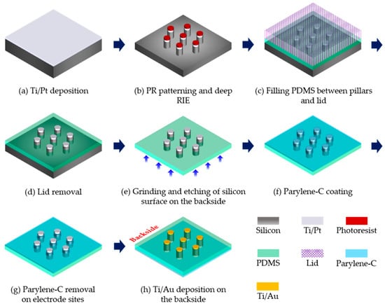 Next, an insulating layer was coated on the topside of the microelectrode array for more focused stimulation. As shown in Figure 2f, 2 μm-thick parylene-C was coated (NRPC-500, Nuritech, Incheon, Korea). An adhesion promoter (Silquest A-174, Merck, Darmstadt, Germany) was used to enhance the adhesion between parylene-C and the topside of the microelectrodes. Then, a dry etching process was performed to expose the electrode sites, using a patterned mask made of a photoresist (AZ9260, MicroChemicals, Ulm, Germany), with a thickness of 11 μm. Using a reactive ion etching process (VITA, Femtoscience, Hwaseong, Korea), parylene-C on the electrode sites was removed with a power of 200 W and an oxygen gas flow of 100 sccm for 15 minutes, as shown in Figure 2g.
