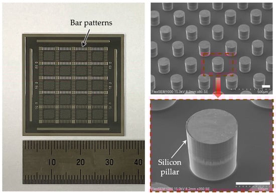 (Left) Photograph of a chip containing 20 arrays of circular silicon pillars, in a dimension of 35 mm × 35 mm. (Right) Scanning electron microscopic (SEM) images of silicon pillars after deep reactive ion etching. The scale bars are 100 μm.
