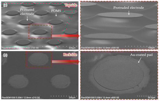 Figure 5 shows the scanning electron microscopic (SEM) images (FlexSEM 1000, Hitachi, Tokyo, Japan) of the microelectrodes. The Pt-coated electrodes protruded around 20 μm from the PDMS base, as shown in Figure 5a. The height of the protruded electrodes can be controlled by both the pressing strength of the binder clips and the strength of the PDMS lid. The higher the pressure of the binder clips, the stronger the elastic PDMS lid can press the PDMS between the silicon pillars, resulting in more protruded electrodes. On the other hand, if the pressure of the binder clips is constant, the height of the protruded electrodes can be varied according to the elasticity of the lid itself. The elasticity of the lid may depend on the mixing ratio, curing temperature, and curing time [,]. Figure 5b shows the Au-coated connection pads on the backside of the microelectrodes. Although the diameter of the patterned mask was set to be the same as the diameter of the pads, the metal layers were deposited slightly wider than the pad area. Since the mask physically covered the pads, resulting in a little gap, metal ions spread beyond the pad area. However, it can be easily corrected by reducing the diameter of the masking pattern.