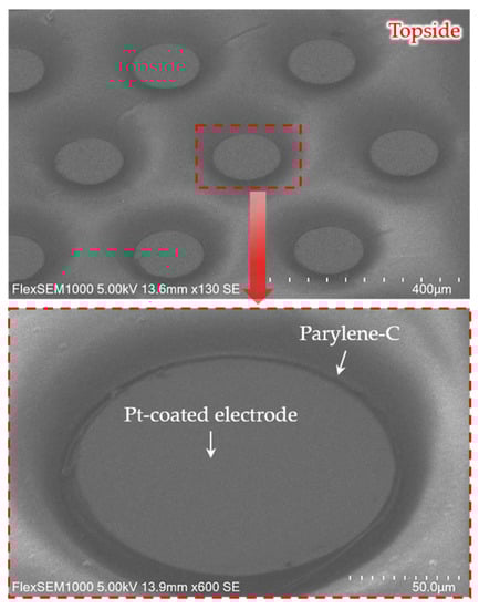 SEM images of the electrode array insulated by parylene-C, excluding the electrode sites.