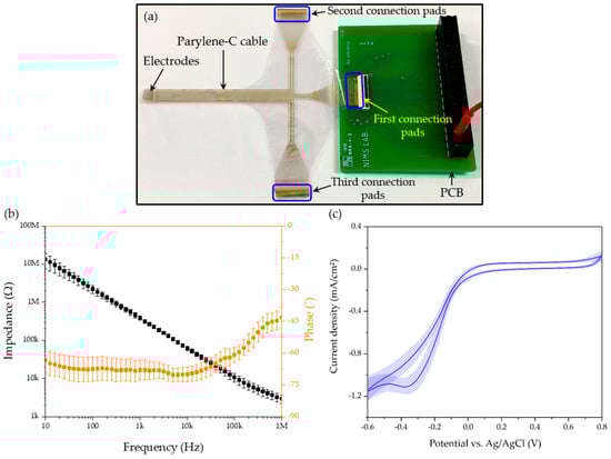 Electrochemical impedance spectroscopy (EIS) and cyclic voltammetry (CV) were performed to investigate the electrical properties of the fabricated microelectrodes. The electrodes were connected using a custom-designed parylene-C cable fabricated based on a previous study []. To connect the pads of the electrode array with the parylene-C cable, conductive epoxy (Duralco™ 125-2, Contronics, Brooklyn, NY, USA) was used, and the assembled device was cured in an oven at 35 °C for 16 hours. Next, the parylene-C cable was connected to a printed circuit board (PCB), through a zero-insertion-force (ZIF) connector. As the ZIF connector (502598-3393, Molex, Lisle, IL, USA) had only 33 channels, all 98 electrodes could not be connected to the connector at the same time. Thus, we designed the parylene-C cable to have three parts of connection pads: the first part had 32 electrical lines and pads to connect 32 electrodes in the center of the array, while the second and third parts had 33 electrical lines and pads each, to connect the remaining electrodes. For EIS, a potentiostat (Reference 600+, Gamry Instruments, Warminster, PA, USA) and a custom-designed faraday cage with a dimension of 30 cm × 38 cm × 52 cm were used. The fabricated electrode array, an Ag/AgCl electrode, and a platinum wire were used as the working electrodes, the reference electrode, and the counter electrode, respectively. The prepared electrodes were immersed in phosphate buffer saline (PBS) solution (PBS 10010023, Thermo Fisher Scientific, Waltham, MA, USA), and the frequency was swept from 10 Hz to 1 MHz with a sinusoidal AC input voltage of 30 mVrms. For CV, the potential limits were set from −0.6 V to 0.8 V, at a scan rate of 50 mV·s−1 [,].