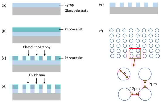 Schematic illustration of the microfabrication process and the design of the microwell array template. (a) Cytop is coated on the top of the glass wafer. (b) Photoresist is spin-coated on the Cytop layer. (c) The glass wafer is patterned by standard photolithography. (d) The photoresist layer and Cytop layer are etched by O2 reactive ion etching. (e) Photoresist layer is removed and the microwell array template is obtained. (f) The microwell template is arranged in a quadrilateral pattern with separations of 12 µm in both x- and y- directions. Three different sizes of the microwell are designed (d = 2.4 µm, 3.3 µm and 4.3 µm, respectively).