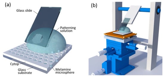 Schematic illustration of (a) patterning of the melamine microspheres on the microwell array template by (b) adjustable self-assembly setup.