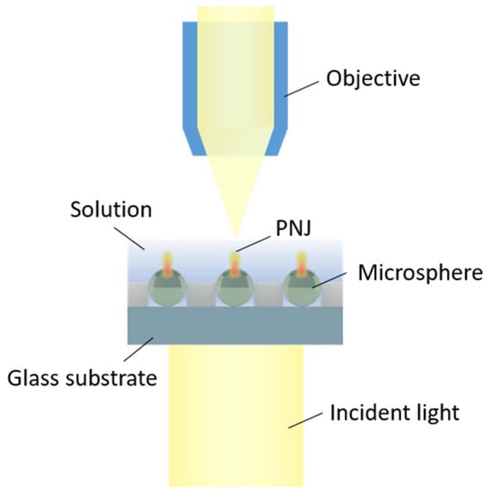 The as prepared microsphere array was configured with a glass ring on the top. Milli-Q water was introduced into the glass ring, in which the microspheres were fully immersed. The microsphere array was illuminated by a light-emitting diode (LED) white light source from the bottom of the glass substrate. A 20× objective with NA of 0.8 (Zeiss Objective Plan-Apochromat, Zeiss, Oberkochen, Germany) was utilized to image the PNJ from the top of the microsphere array, focusing on the focal plane of the microspheres (Figure 3).