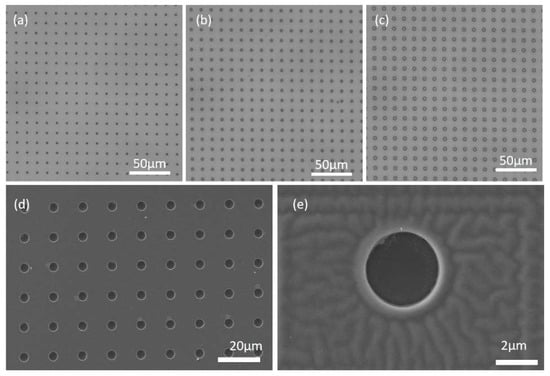 Morphology of the microwells. (a–c) represent the microwells with the size of 2.4 µm, 3.3 µm and 4.3 µm, respectively, characterized by a conventional optical microscope; (d) scanning electron microscope (SEM) image of the 3.3 µm microwells and (e) the enlarged SEM image of a single microwell.