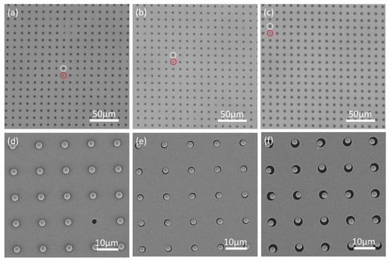 After the fabrication of the microwell array, carboxyl-functionalized melamine microspheres of 3 μm were patterned via TASA approach. These commercial available melamine microspheres are practically uniform in size with standard deviation <0.1 μm. Furthermore, the previous work shows that the melamine sphere of 3 μm possesses excellent optical focusing capability than that of other sizes [11], which is beneficial to generate PNJ with best optical focusing capability in our experiment. After the patterning process, the microwell array with the patterned melamine spheres was characterized under an optical microscope and a scanning electron microscope (Figure 5). It is shown that the microspheres are precisely loaded into each individual microwell without access microspheres on the raised regions of the template. Moreover, the configuration of microspheres occupying a microwell is determined by the size of the template microwell and the size of the microspheres. For the microwells with 2.4 µm (Figure 5a), since the size of the microwell is smaller than the microsphere (3 µm), the microspheres were trapped partially on their lower surface into the microwell. This can be seen clearly on the SEM images (Figure 5d). However, for the microwells of 3.3 µm or 4.3 µm, who have larger size than the microsphere, fully entry of the microsphere into the microwell occurred. This can also be observed clearly on the template microwells of 3.3 µm and 4.3 µm (Figure 5e,f), in which the microspheres were pushed onto the sidewall, leaving excess rooms in the microwell.