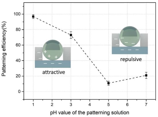 The pH value of the patterning solution exhibits a significant influence on the patterning efficiency. To study the pH effect, a patterning solution with different pH values (pH = 1.0, 3.0, 5.0 and 7.0) was used during the patterning process, respectively. We analyzed the patterning efficiency after 15 patterning cycles and the pH dependent patterning efficiency of the template with microwells of 4.3 µm is shown in Figure 6. It is shown that the patterning efficiency strongly depended on the pH value of the patterning solution. With the increase of the pH value, the patterning efficiency decreases. The patterning solution with pH value of 1.0 yielded the highest patterning efficiency (~99%). This result revealed the electrostatic nature of the patterning process. As reported from the literature [22], the pH value of the patterning solution influences the species of the charge on the surface of the microspheres and the bottom substrate, respectively, due to the isoelectric point of different materials. Thus, the electrostatic force caused by these charges has an impact on the entry of the microspheres into microwells. In our experiments, higher pattering efficiencies were obtained for pattering solution with lower pH (≤3.0). Considering the isoelectric point of the melamine microsphere (~3), the Cytop layer (~2) and glass substrate (<3), at a patterning solution of pH lower than 3.0, the microspheres actually hold the positive charges, while the substrate holds negative charges. In this case, their electrostatic interaction is positive, that is, microspheres are attracted into the microwells to a greater extent, thus promoting the patterning efficiency and stability during the patterning process.