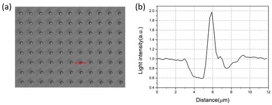 To observe the light-focusing effect of the microsphere, the microsphere array was immersed in water solution and illuminated from the bottom of the glass substrate, as illustrated in Figure 3. Under such an optical configuration, the as patterned melamine microspheres served as microlens array and could generate PNJs in the close vicinity of the top surface, which can be directly observed by the objective. Since the PNJs possess high light intensity and narrow waist, they can be observed by first focusing on the vicinity of the top surface of the microsphere, where bright white spots emerged in the view, and then followed by fine tuning the focal plane of the white spots to the highest light intensity, as in Figure 7a. It is shown that the arrayed microspheres showed excellent light focusing capability. Individual microspheres focused the light illumined from the bottom into a highly localized white spot, i.e., the PNJ. The PNJ possessed high light intensity and a peak at the center of the microsphere (Figure 7b). The peak value can be as high as ~2 fold the background light signal. It is demonstrated in Figure 7a that a large-scale PNJ array with a defined pattern and spacing was achieved. Furthermore, the arrayed melamine microspheres possess excellent size uniformity and highly consistent radial position (direction along the incident light) in the microwells. Furthermore, they possess high refractive index (1.68), low light absorbance, and optimal light-focusing capability in water [22]. Thus with these advantages, the PNJs generated by these microspheres in Figure 7a could exhibit nearly identical geometry parameters and height on the radial position. These homogenized PNJ array has great potential in practical applications, especially in super-resolution imaging, subwavelength-resolution nanopatterning, and nano objects trapping and detection.