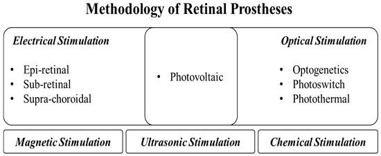 Despite these promising results from the clinical trials in the early stages, there remains substantial room for further improvement, from both engineering and physiological perspectives. The most critical issue is the relatively low quality of the visual perception enabled by retinal prostheses when compared to normal vision. This is presumably attributed to the low spatial resolution of the stimulation in a dense network of retinal cells [5,25,38,39]. To achieve higher spatial resolution, a variety of retinal prosthetic strategies have been proposed for ES, based on special structures of electrodes or optimization of stimulation parameters. Moreover, strategies based on other modalities have been proposed, such as optogenetics, light-driven exogenous materials, ultrasonic waves, and magnetic fields, etc., as shown in Figure 1. This review aims to provide a detailed description of distinctive stimulation strategies, with a specific focus on a quantitative estimation of the spatial resolution. A discussion of future perspectives towards improvement of visual perception in visually impaired patients is also provided.