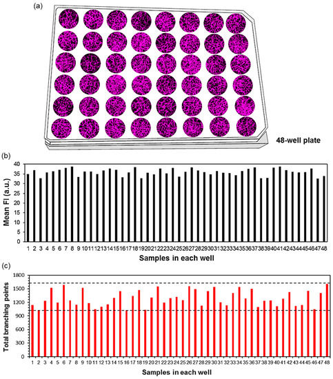 Assessment of the reproducibility of the three-dimensional (3D) model of blood capillary to be used as a microarray assay. (a) Representative CD31 immunostaining (endothelial marker) of the 48 different 3D-blood capillary models constructed in the medium-throughput 48-well plate illustration. (b) Mean fluorescence intensity of each sample in 48-well plates. (c) Total branching points from each of the 3D-blood capillary models (48 samples). Dotted lines indicate the range of the branching points of all samples in the plate (1020–1620) to validate the quality of each sample.