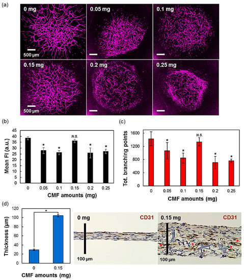 Before obtaining the reproducibility of the Figure 1 model, we also investigated the effect of different amounts of CMF in the 3D-blood capillary models and optimized it. Different amounts of CMF (0, 0.05, 0.1, 0.15, 0.2, and 0.25 mg per drop tissue) were used and cultured in the same condition described in the methods. After being cultured for five days, the 3D-tissue models were fixed and immunostained by the CD31 antibody (specific marker for endothelial cells) whose fluorescence was monitored and observed by CLSM, as shown in Figure 2a. From the quantification data of the mean fluorescence intensity (Figure 2b), all of the conditions excepted the 0.15 mg of CMF showed a significantly lower CD31 staining, when compared to the condition without CMF. This phenomenon also happened for total branching points data (Figure 2c). Although the tissue model without CMF seemed to form similar blood capillary network than the 0.15 mg CMF one, the thickness of the tissue was later found much thinner as compared to the 0.15 mg CMF tissue model (Figure 2d), as measured on the histology data. These results showed that the CMF could act as a filler to provide a thicker tissue. Therefore, this higher thickness provided by the CMF induced significantly higher opened lumen structures of the blood capillaries, as shown in the tissue section of the histology data (red asterisk) in Figure 2d (2.31 ± 0.22 µm and 20.93 ± 0.55 µm of inner diameters for 0 and 0.15 mg CMF, respectively) [23].